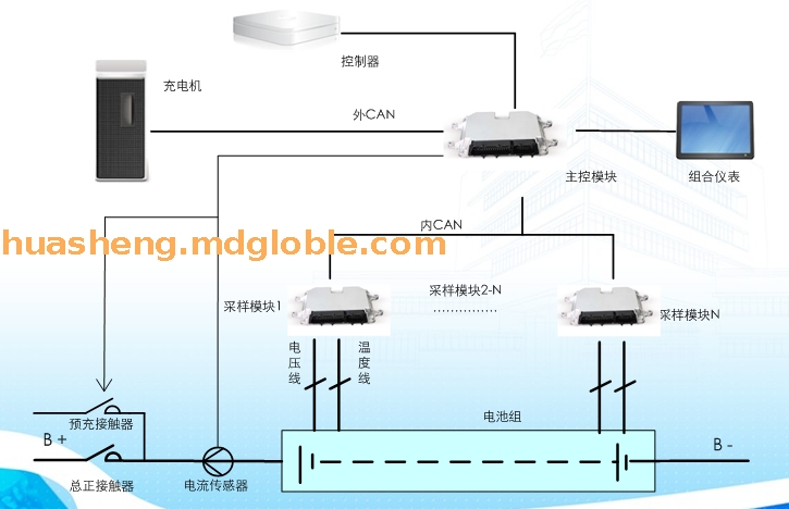 锂电池,镍氢电池或铅酸电池用车载动力电池管理系统或大容量储能电站电池管理系统.车载电池管理系统适用于纯电动乘用车或混合动力汽车,储能电站电池管理系统可根据用户要求定制.